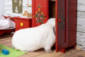 Проект строится как серия постановочных студийных сцен. Я разрабатываю пространство, реквизит и общую атмосферу сцены, однако сами кролики свободно выбирают, как и в какой роли в ней существовать. Моя задача как фотографа — наблюдать, не вмешиваться в процесс и фиксировать момент, в котором образ складывается сам.